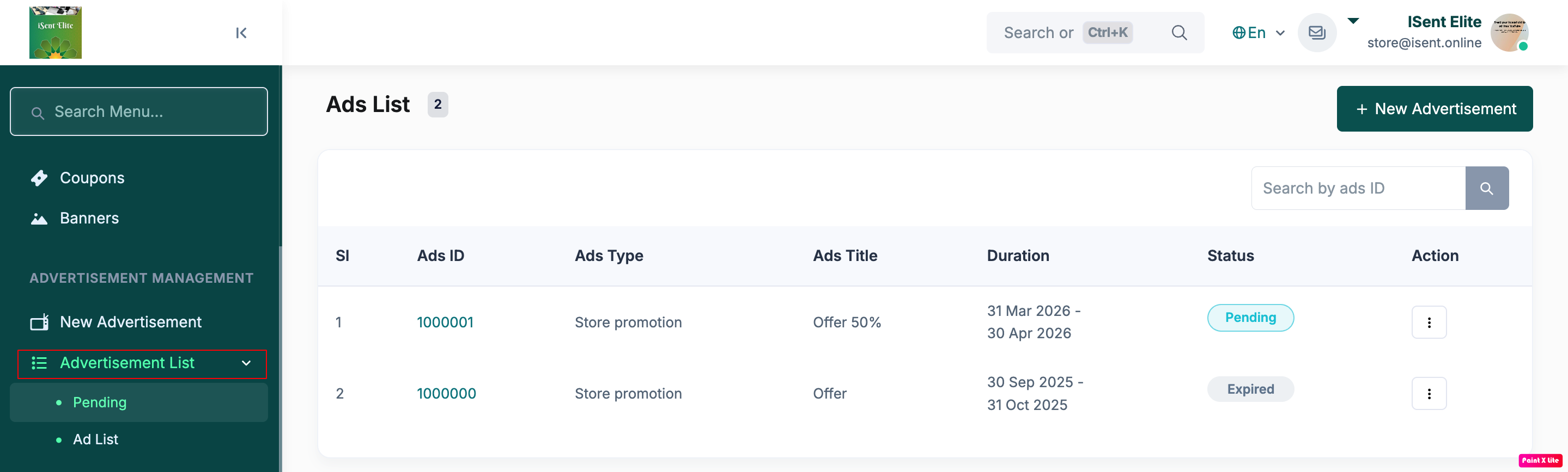 Step 1: Click Advertisement List in the left sidebar.