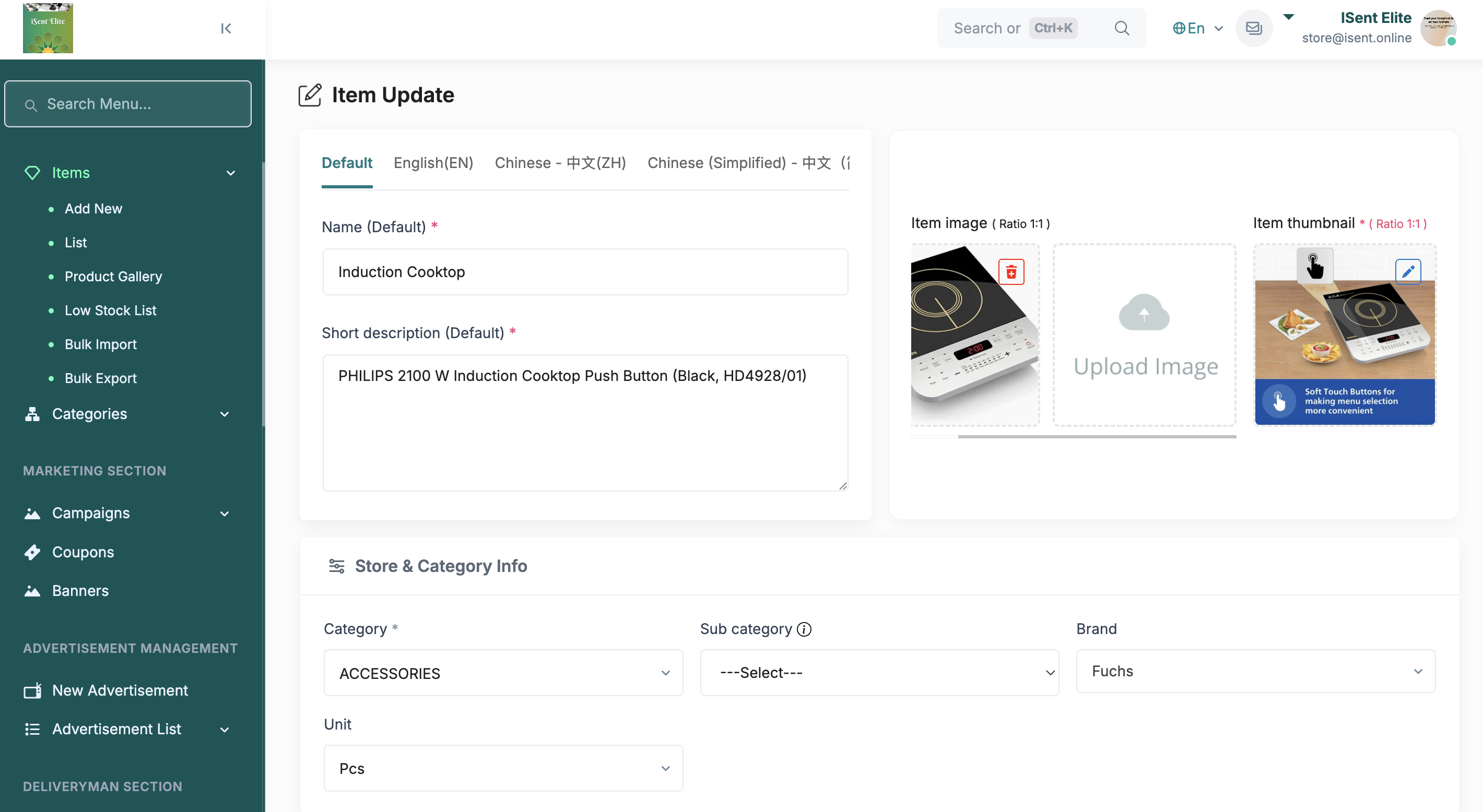 - In Store & Category Info , select or update Category , Sub Category , Brand , and Unit (as required).